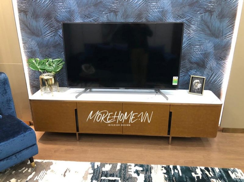 Mẫu kệ tivi phong cách hiện đại với khung gỗ công nghiệp kết hợp chân kệ inox mạ vàng cao cấp do Morehome thực hiện