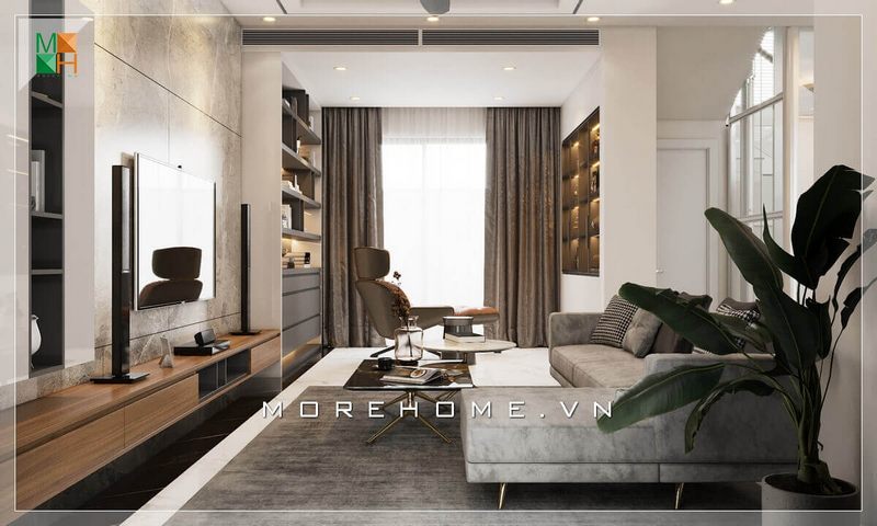 Mảng tường đối diện được đặt 1 chiếc kệ tivi bằng gỗ kiểu cách hiện đại chi tiết đơn giản nhưng tiện nghi nhất định. Chiếc kệ trang trí ngang được đặt trên cao giúp cho mảng tường không còn trống trải.
