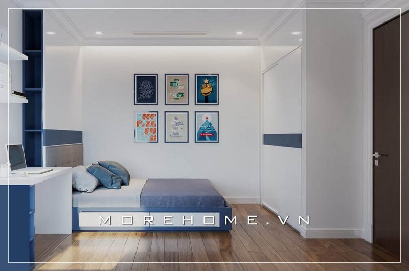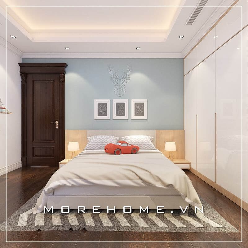 Mẫu giường ngủ gỗ công nghiệp hiện đại, gam màu trắng chủ đạo tạo cho phòng ngủ 2 bé trai thêm phần rộng thoáng hơn cả