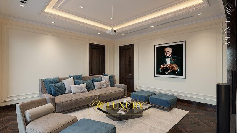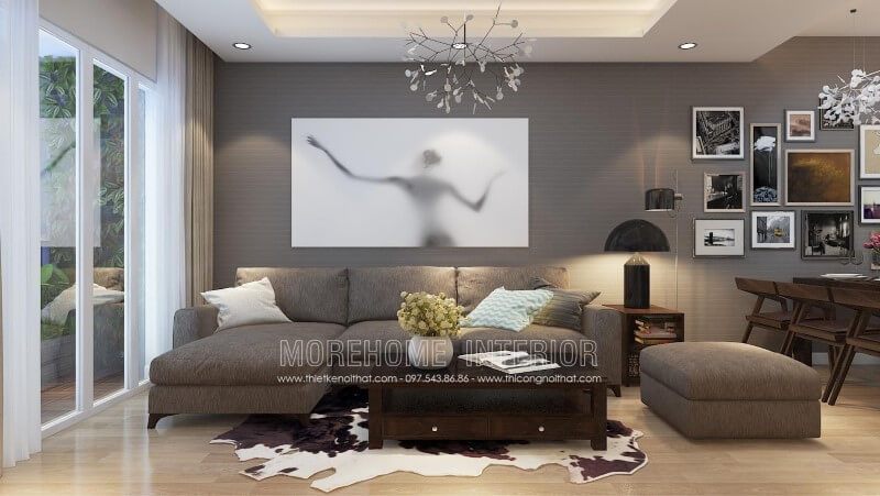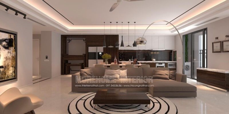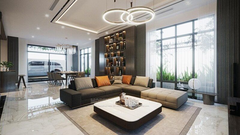 Phòng khách thiết kế hiện đại phối màu sáng và trầm tạo nên không gian hài hoà ấm cúng nhưng cũng rất sang trọng.
