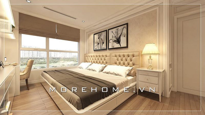 Thiết kế phòng ngủ chung cư tiện nghi, nội thất được sắp xếp hợp lý vẫn đảm bảo độ rộng thoáng cho căn phòng
