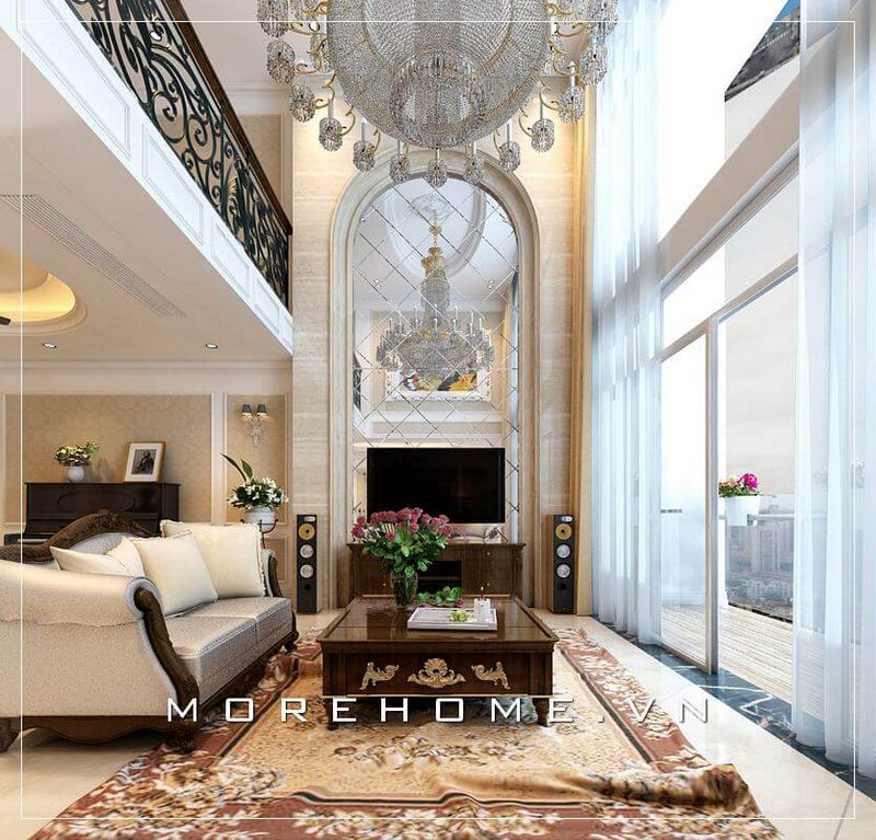 Mẫu thiết kế phòng khách biệt thự cao cấp với nội thất tân cổ điển có đường nét tinh tế, hệ thống cửa kính cường lực lớn tạo nên một không gian sang trọng và đẳng cấp với ánh sáng tuyệt đẹp.