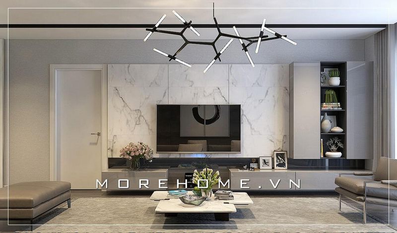 Vách tivi được thiết kế bằng đá tự nhiên ốp tường màu trắng hiện đại và có phong cách sang trọng.