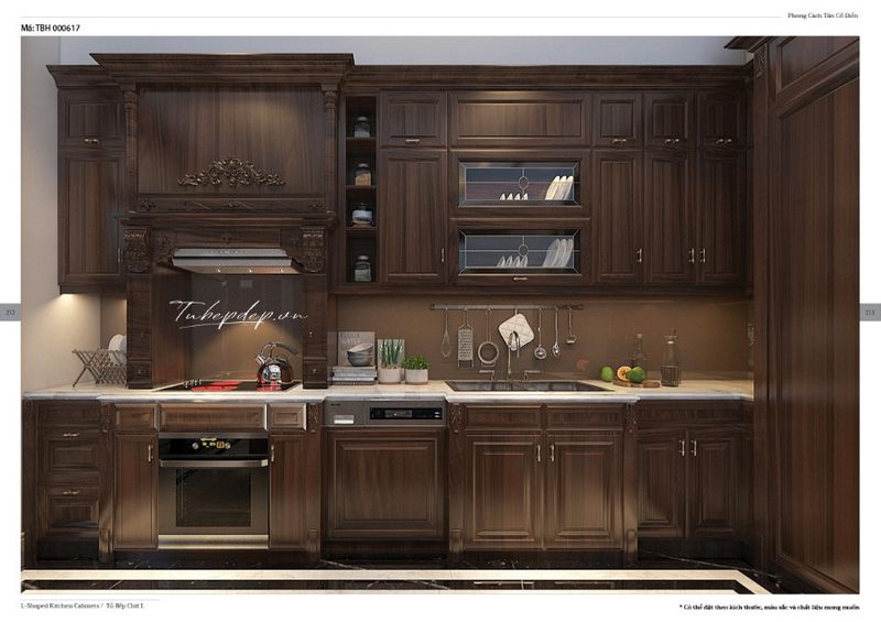 Họa tiết cầu kì nổi bật trên mẫu tủ bếp gỗ óc chó tân cổ điển nâu trầm sẽ tạo nên một sức hút khó cưỡng để làm nổi bật phòng bếp của ngôi nhà của bạn.